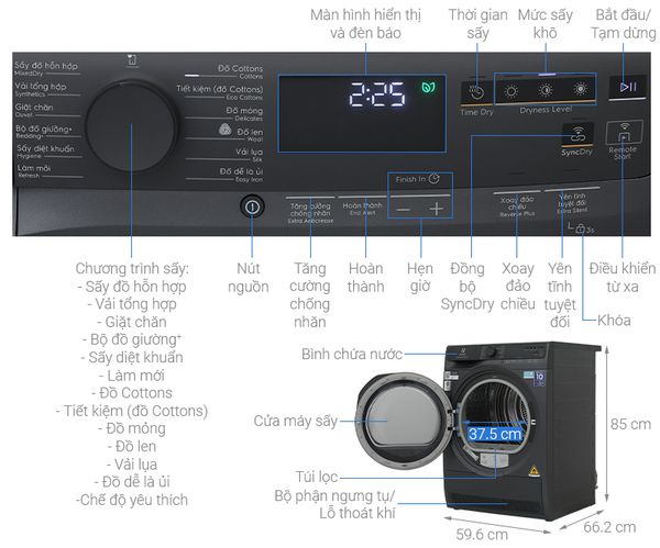Đồng bộ SyncDry Điều khiển qua ứng dụng Electrolux Tăng cường chống nhăn Extra Anticrease Tùy chỉnh thời gian và mức độ sấy Sấy siêu im lặng Extra Silent Sấy diệt khuẩn HygieneKết nối từ xa Remote Start Khóa trẻ em Hẹn giờ hoàn thành Hiển thị bằng màn hình đèn LEDCông nghệ Woolmark dành để sấy riêng cho đồ len Công nghệ SensiCare chăm sóc quần áo tránh bị hư tổn Công nghệ DelicateCare bảo vệ đồ len không bị biến dạng Công nghệ ColourCare Chế độ Refresh loại bỏ mùi ẩm mốc Chương trình sấy đồ hỗn hợp thông minh MixedDry Chương trình sấy đồ mỏng Chuông báo lấy quần áo khi kết thúc Cảm biến độ ẩm 3DSense để điều chỉnh thời gian sấy phù hợpReverseTumbling sấy đảo chiều chống nhăn, giúp áo quần không bị xoắn rối Đèn chiếu sáng lồng sấyTạm dừng thêm quần áoTự khởi động lại khi có điện
